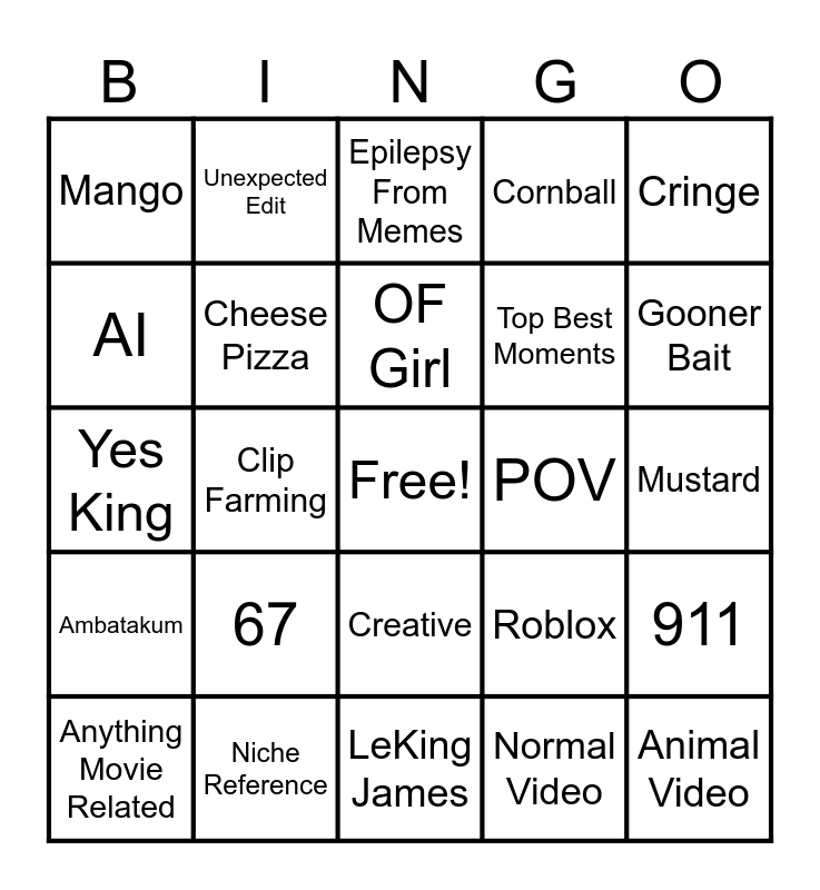This bingo card has a free space and 24 words: 67, Niche Reference, OF Girl, Anything Movie Related, Cringe, Mango, AI, Unexpected Edit, POV, Creative, Top Best Moments, Yes King, Roblox, 911, Cheese Pizza, Normal Video, Mustard, Epilepsy From Memes, Gooner Bait, Clip Farming, Animal Video, Ambatakum, Cornball and LeKing James.