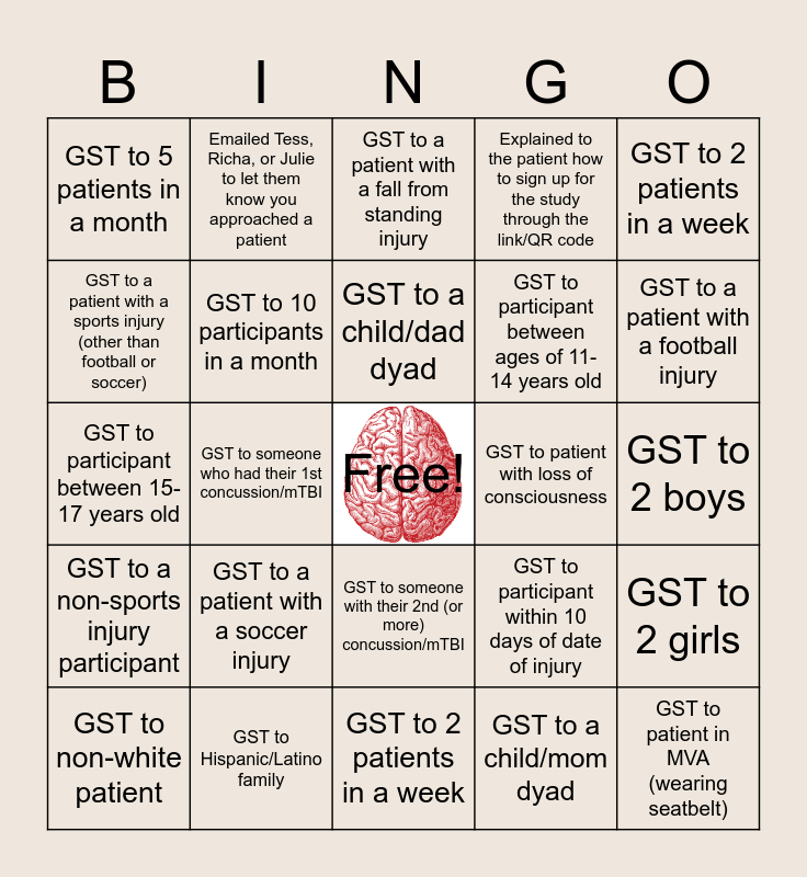 This bingo card has a free space and 24 words: GST to a patient with a soccer injury, GST to Hispanic/Latino family, GST to a child/dad dyad, GST to non-white patient, GST to 2 patients in a week, GST to 5 patients in a month, GST to a patient with a sports injury (other than football or soccer), Emailed Tess, Richa, or Julie to let them know you approached a patient, GST to patient with loss of consciousness, GST to someone with their 2nd (or more) concussion/mTBI, GST to participant between ages of 11-14 years old, GST to participant between 15-17 years old, GST to participant within 10 days of date of injury, GST to 2 girls, GST to 10 participants in a month, GST to a child/mom dyad, GST to 2 boys, GST to a patient with a fall from standing injury, GST to a patient with a football injury, GST to someone who had their 1st concussion/mTBI, GST to patient in MVA (wearing seatbelt), GST to a non-sports injury participant, Explained to the patient how to sign up for the study through the link/QR code and GST to 2 patients in a week.