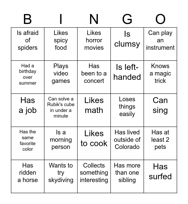This bingo card has a free space and 24 words: Is a morning person, Wants to try skydiving, Has been to a concert, Has ridden a horse, Can play an instrument, Is afraid of spiders, Had a birthday over summer, Likes spicy food, Loses things easily, Likes to cook, Is left-handed, Has a job, Has lived outside of Colorado, Has at least 2 pets, Plays video games, Has more than one sibling, Can sing, Likes horror movies, Knows a magic trick, Can solve a Rubik's cube in under a minute, Has surfed, Has the same favorite color, Is clumsy and Collects something interesting.