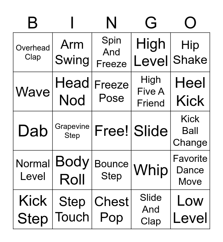 This bingo card has a free space and 24 words: Body Roll, Step Touch, Freeze Pose, Kick Step, Hip Shake, Overhead Clap, Wave, Arm Swing, Slide, Bounce Step, High Five A Friend, Dab, Whip, Favorite Dance Move, Head Nod, Slide And Clap, Kick Ball Change, Spin And Freeze, Heel Kick, Grapevine Step, Low Level, Normal Level, High Level and Chest Pop.