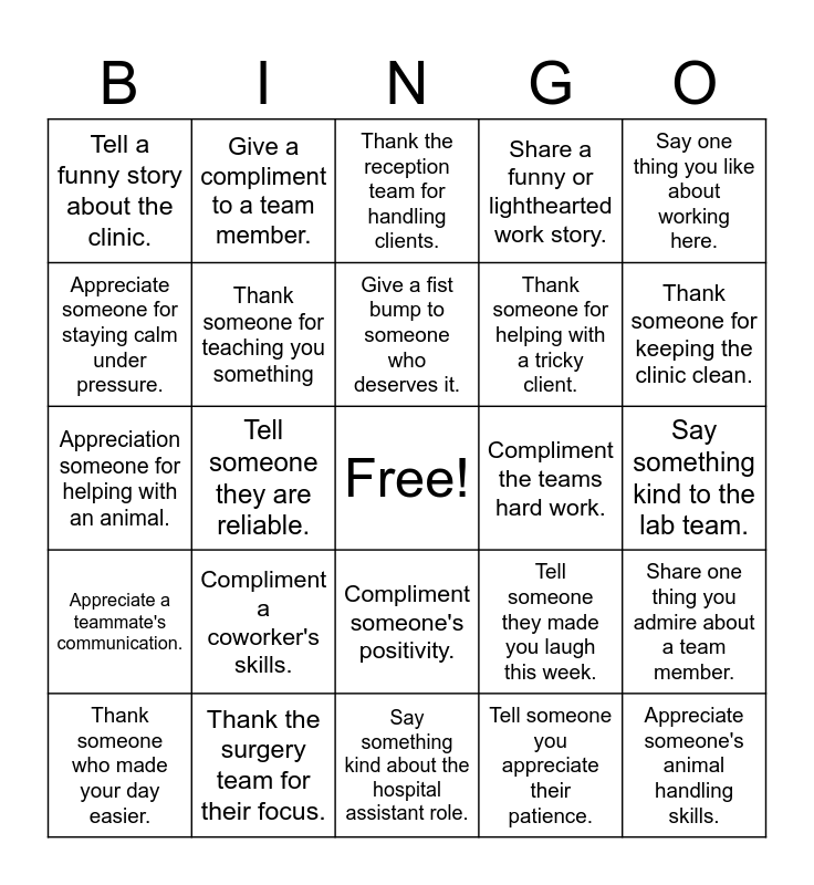 This bingo card has a free space and 24 words: Thank someone who made your day easier., Compliment a coworker's skills., Give a fist bump to someone who deserves it., Tell someone you appreciate their patience., Say one thing you like about working here., Tell a funny story about the clinic., Give a compliment to a team member., Thank the reception team for handling clients., Compliment the teams hard work., Say something kind to the lab team., Appreciation someone for helping with an animal., Thank someone for teaching you something, Tell someone they made you laugh this week., Share one thing you admire about a team member., Appreciate someone for staying calm under pressure., Thank the surgery team for their focus., Say something kind about the hospital assistant role., Share a funny or lighthearted work story., Thank someone for keeping the clinic clean., Appreciate a teammate's communication., Tell someone they are reliable., Compliment someone's positivity., Thank someone for helping with a tricky client. and Appreciate someone's animal handling skills..