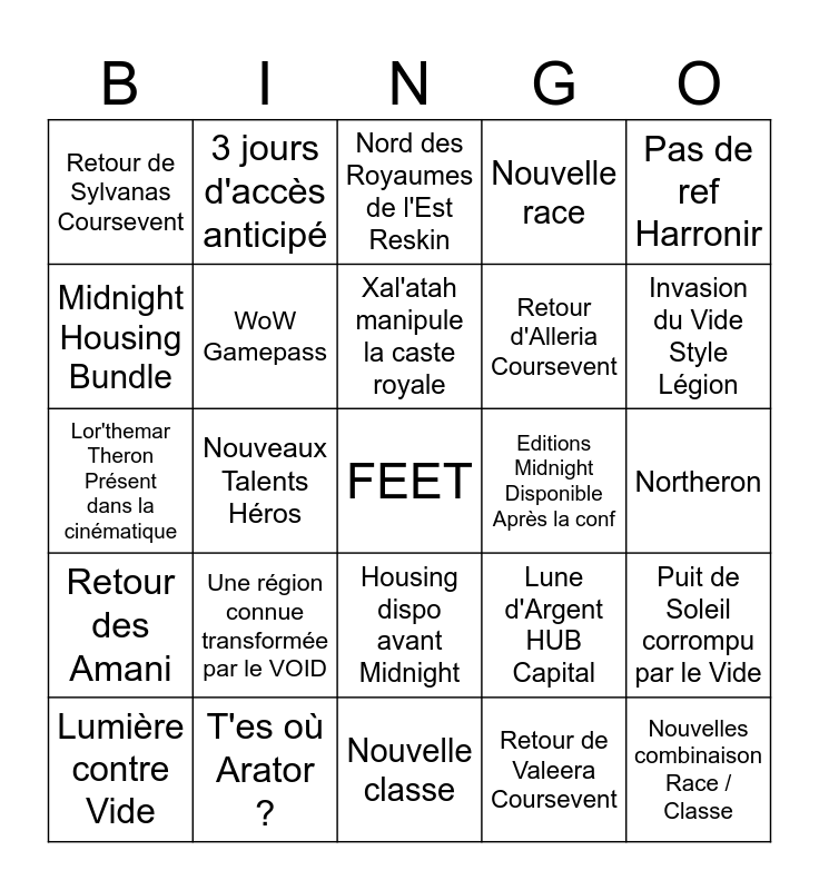 This bingo card has a free space and 24 words: Une région connue transformée par le VOID, T'es où Arator ?, Xal'atah manipule la caste royale, Lumière contre Vide, Pas de ref Harronir, Retour de Sylvanas Coursevent, Midnight Housing Bundle, 3 jours d'accès anticipé, Editions Midnight Disponible Après la conf, Housing dispo avant Midnight, Retour d'Alleria Coursevent, Lor'themar Theron Présent dans la cinématique, Lune d'Argent HUB Capital, Puit de Soleil corrompu par le Vide, WoW Gamepass, Retour de Valeera Coursevent, Northeron, Nord des Royaumes de l'Est Reskin, Invasion du Vide Style Légion, Nouveaux Talents Héros, Nouvelles combinaison Race / Classe, Retour des Amani, Nouvelle race and Nouvelle classe.