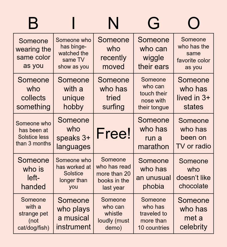 This bingo card has a free space and 29 words: Someone with a strange pet (not cat/dog/fish), Someone from a different country, Someone who speaks 3+ languages, Someone with 5+ tattoos, Someone wearing the same color as you, Someone who recently moved, Someone with a unique hobby, Someone who has worked at Solstice longer than you, Someone who has run a marathon, Someone who plays a musical instrument, Someone who has been on TV or radio, Someone who has met a celebrity, Someone who can whistle loudly (must demo), Someone who has traveled to more than 10 countries, Someone who has lived in 3+ states, Someone who can juggle, Someone who has read more than 20 books in the last year, Someone who is left-handed, Someone who has the same favorite color as you, Someone who has been at Solstice less than 3 months, Someone who has an unusual phobia, Someone who has broken a bone, Someone who can touch their nose with their tongue, Someone who collects something, Someone who can wiggle their ears, Someone who has binge-watched the same TV show as you, Someone who doesn’t like chocolate, Someone who has tried surfing and Someone who has more than two siblings.