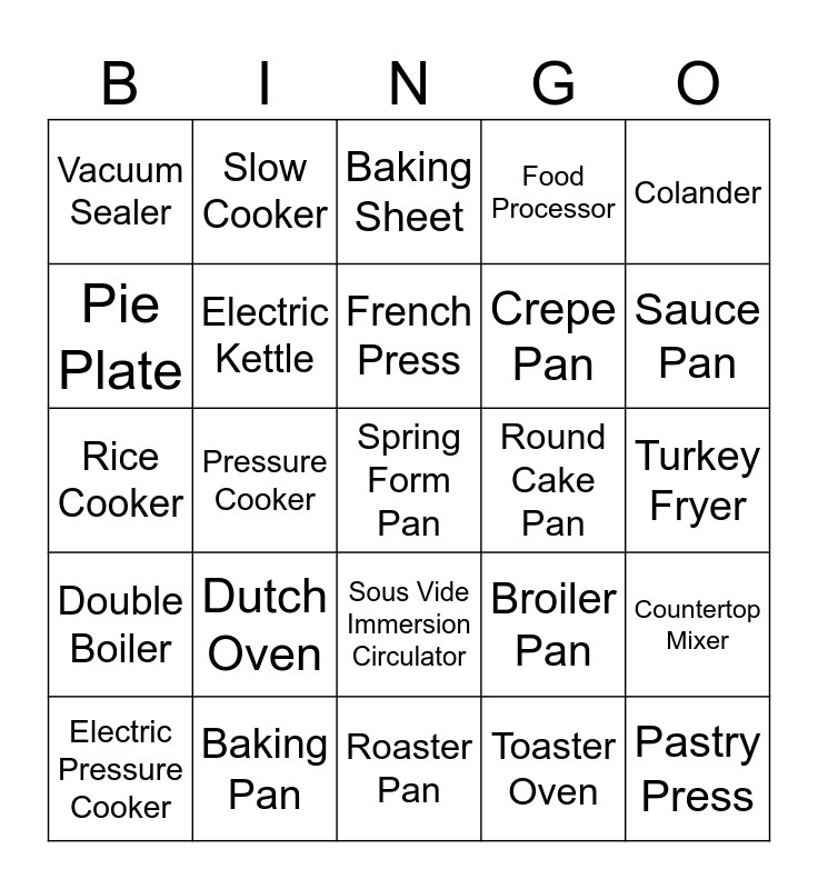 This bingo card has 36 words: Air Fryer, Bread Machine, Coffee Grinder, Crepe Pan, Countertop Mixer, Electric Pressure Cooker, Electric Kettle, Electric Skillet, Food Processor, Hand Mixer, Rice Cooker, Slow Cooker, Sous Vide Immersion Circulator, Toaster Oven, Turkey Fryer, Vacuum Sealer, Baking Pan, Baking Sheet, Broiler Pan, Colander, Double Boiler, Dutch Oven, French Press, Frying Pan, Pastry Press, Pie Plate, Pressure Cooker, Roaster Pan, Round Cake Pan, Sauce Pan, Sauté Pan, Splatter Screen, Spring Form Pan, Steamer Basket, Tub Pan and Wok.