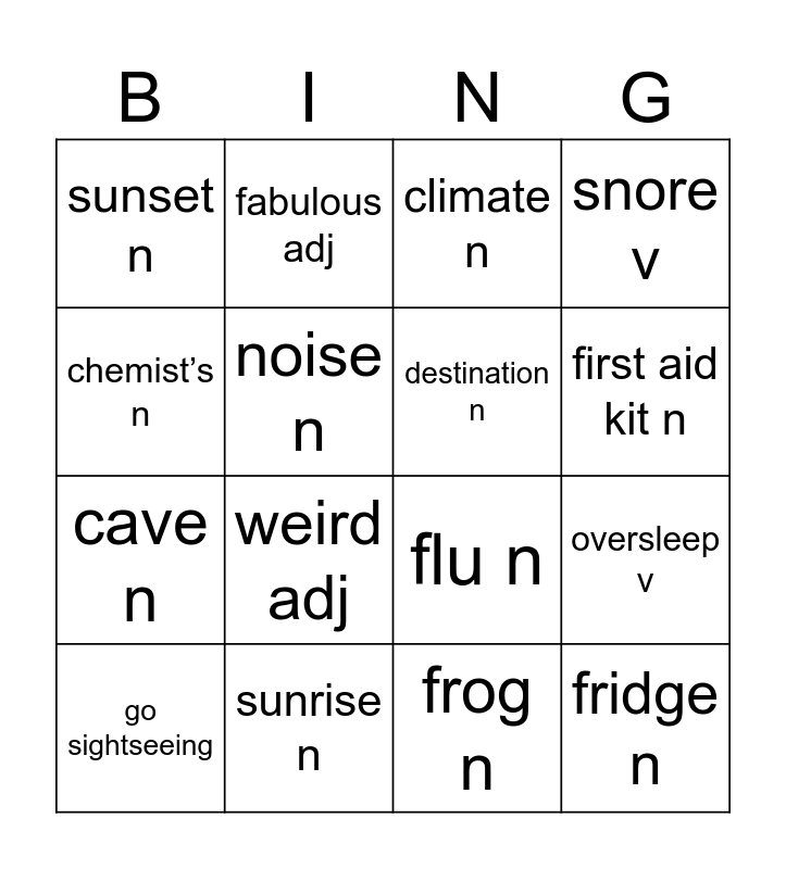 This bingo card has 92 words: Free!, Aborigine n, abroad adv, access n, accident n, accommodation n, ancient adj, artistic adj, available adj, backpacker n, book v, calm down phr v, cattle station n, cave n, chart n, chemist’s n, climate n, coast n, collect v, cough syrup n, customer assistant n, cut n, degree n, delayed adj, desert n, destination n, determine v, diarrhoea n, dorm(itory) n, dozen n, emergency n, escape v, exception n, extra fee n, fabulous adj, facilities n pl, fall ill, fasten one’s seat belt, first aid kit n, flat tyre n, flu n, fridge n, frog n, get sick, go sightseeing, guarantee v, guidebook n, headache n, history n, injury n, insect n, jigsaw puzzle n, look forward to, magnificent adj, marine adj, medicine n, mess n, noise n, overseas adv, oversleep v, overtake v, painkiller n, plaster n, prediction n, reef n, refuse v, sacred adj, scenery n, scissors n pl, scuba dive v, shark n, shelter v, snore v, sore throat n, species n, spot v, sprain n, staff n, stomach ache n, sunbathe v, sunburn n, sunrise n, sunset n, thermometer n, tiny adj, traffic n, travel sickness n, traveller n, turtle n, typical adj, weird adj and wildlife n.