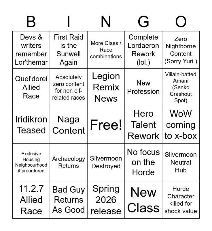 This bingo card has a free space and 29 words: 11.2.7 Allied Race, A really good idea hampered because Blizzard can't allow fun, Naga Content, Overly gratuitous feetshots of Xal'atath in 4k, Devs & writers remember Lor'themar, More Class / Race combinations, Absolutely zero content for non elf-related races, Archaeology Returns, Hero Talent Rework, Bad Guy Returns As Good, WoW coming to x-box, Horde Character killed for shock value, Spring 2026 release, New Class, Villain-batted Amani (Senko Crashout Spot), Inexplicably: Sylvanas, Silvermoon Destroyed, Exclusive Housing Neighbourhood if preordered, Zero Nightborne Content (Sorry Yuri.), Iridikron Teased, No focus on the Horde, Housing in 11.2.7 for preorders, New Profession, Quel'dorei Allied Race, Complete Lordaeron Rework (lol.), First Raid is the Sunwell Again, Silvermoon Neutral Hub, Legion Remix News and The Last Titan News.
