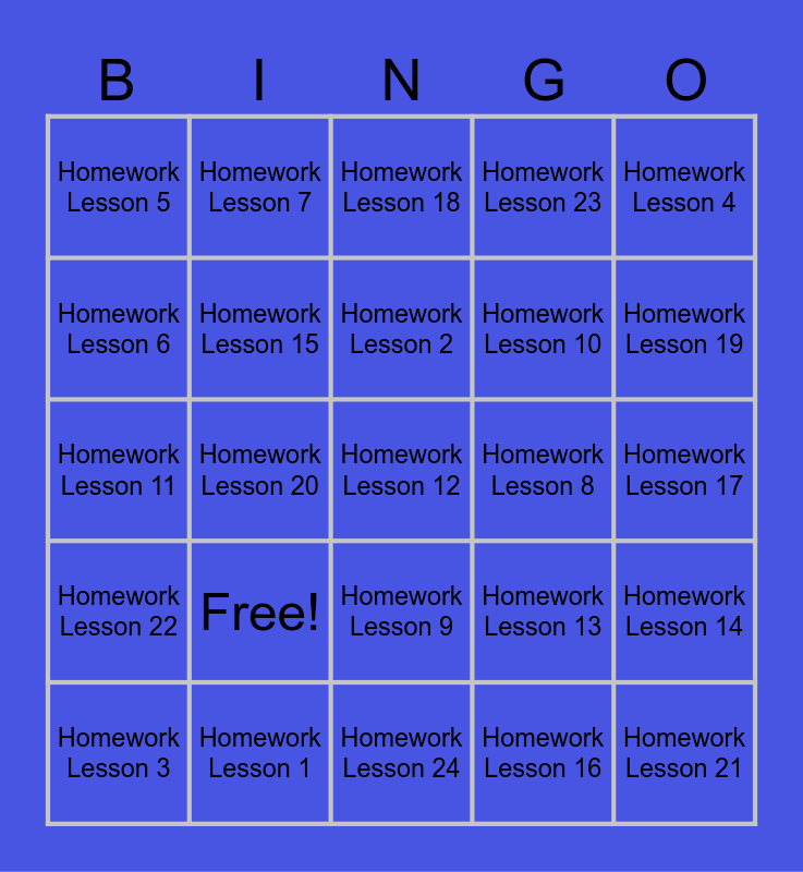 This bingo card has a free space and 24 words: Free!, Homework Lesson 1, Homework Lesson 2, Homework Lesson 3, Homework Lesson 4, Homework Lesson 5, Homework Lesson 6, Homework Lesson 7, Homework Lesson 8, Homework Lesson 9, Homework Lesson 10, Homework Lesson 11, Homework Lesson 13, Homework Lesson 14, Homework Lesson 15, Homework Lesson 16, Homework Lesson 17, Homework Lesson 18, Homework Lesson 19, Homework Lesson 20, Homework Lesson 21, Homework Lesson 22, Homework Lesson 23 and Homework Lesson 24.