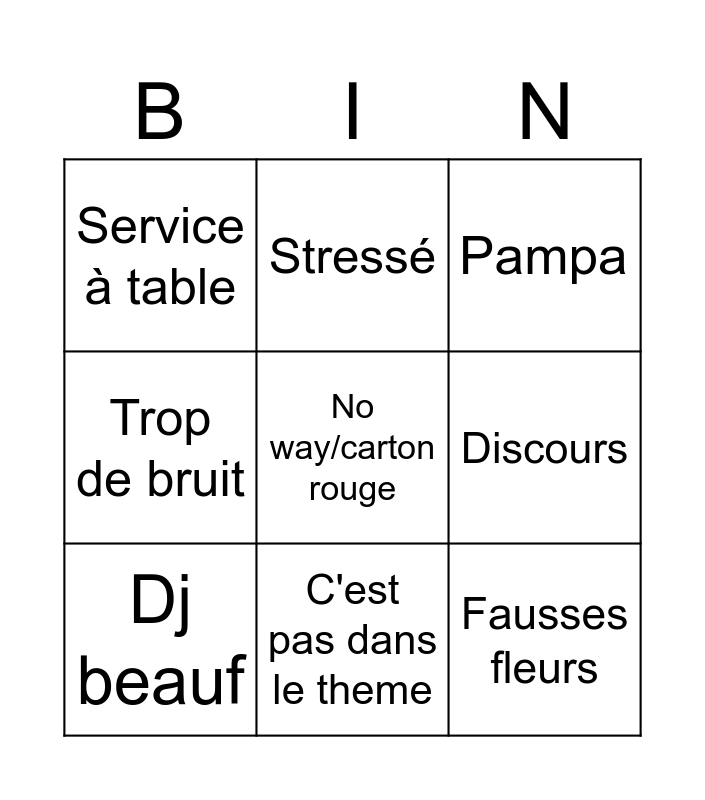 This bingo card has a free space and 8 words: Discours, Pampa, Stressé, Dj beauf, Service à table, Fausses fleurs, Trop de bruit and C'est pas dans le theme.