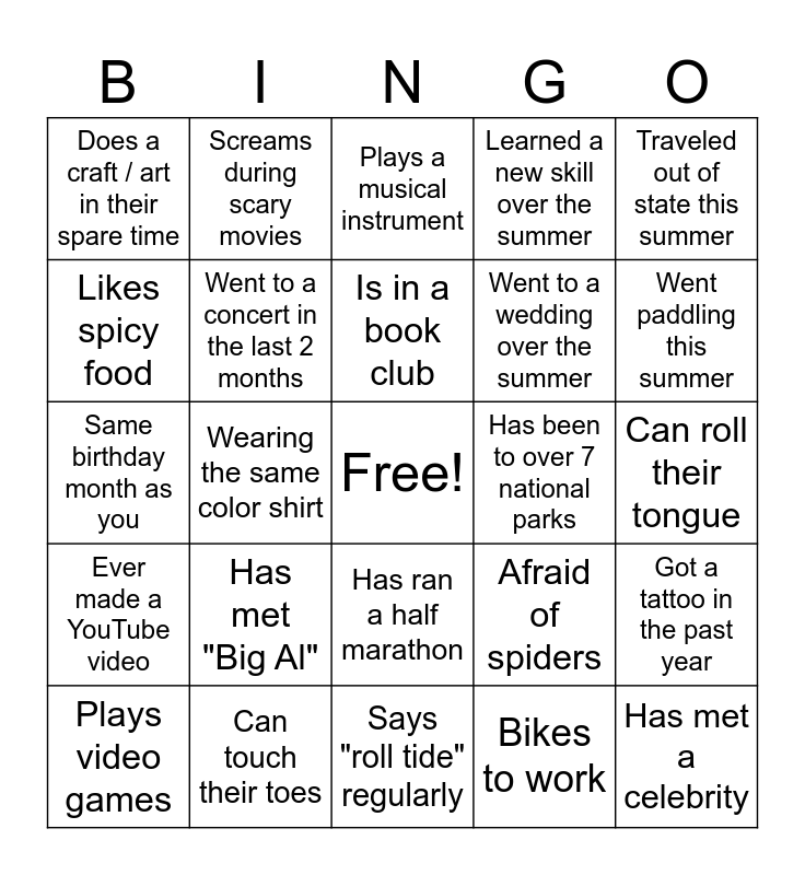 This bingo card has a free space and 24 words: Has met "Big Al", Can touch their toes, Is in a book club, Plays video games, Traveled out of state this summer, Does a craft / art in their spare time, Likes spicy food, Screams during scary movies, Has been to over 7 national parks, Has ran a half marathon, Went to a wedding over the summer, Same birthday month as you, Afraid of spiders, Got a tattoo in the past year, Went to a concert in the last 2 months, Bikes to work, Can roll their tongue, Plays a musical instrument, Went paddling this summer, Wearing the same color shirt, Has met a celebrity, Ever made a YouTube video, Learned a new skill over the summer and Says "roll tide" regularly.