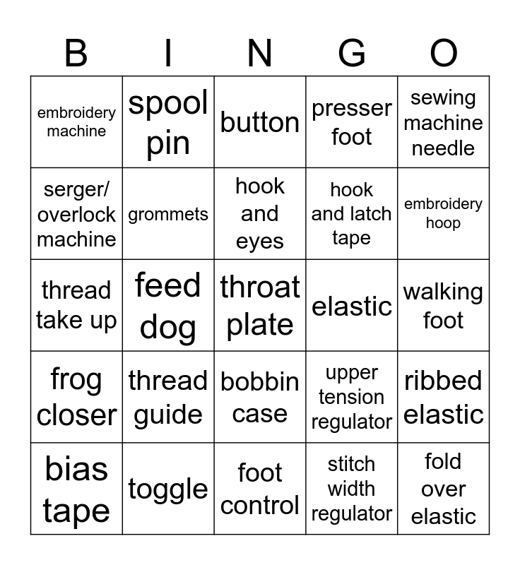 This bingo card has 33 words: balance / hand wheel, bobbin, bobbin case, bobbin winder, embroidery hoop, embroidery machine, feed dog, foot control, presser foot, presser foot lifter, serger/ overlock machine, spool pin, stitch length regulator, stitch width regulator, sewing machine needle, thread take up, thread guide, throat plate, upper tension regulator, walking foot, bias tape, buckle, button, elastic, fold over elastic, frog closer, grommets, hook and eyes, hook and latch tape, ribbed elastic, sew on snaps, toggle and zipper.
