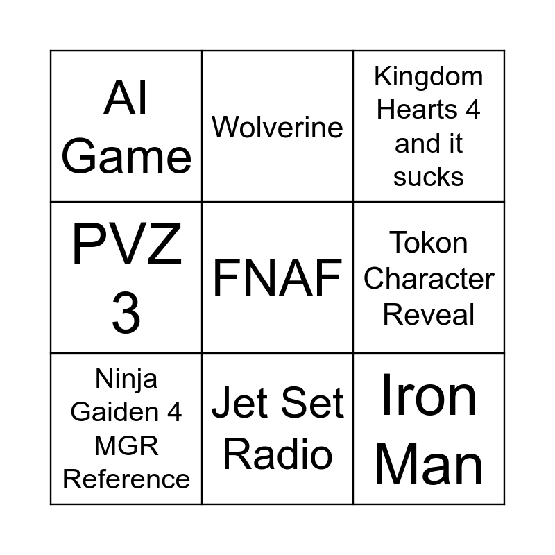 This bingo card has a free space and 8 words: Tokon Character Reveal, Kingdom Hearts 4 and it sucks, Wolverine, Ninja Gaiden 4 MGR Reference, AI Game, Iron Man, PVZ 3 and Jet Set Radio.