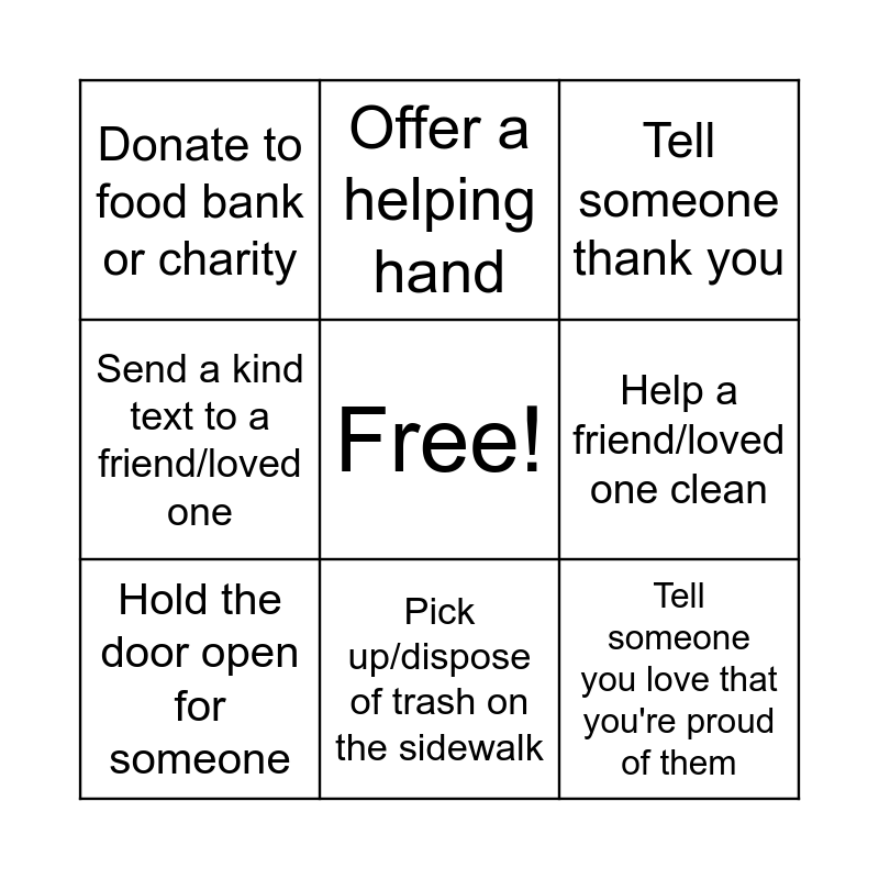 This bingo card has a free space and 9 words: Hold the door open for someone, Tell someone thank you, Offer a helping hand, Send a kind text to a friend/loved one, Donate to food bank or charity, Help a friend/loved one clean, Tell someone you love that you're proud of them, Send someone a joke to cheer them up and Pick up/dispose of trash on the sidewalk.