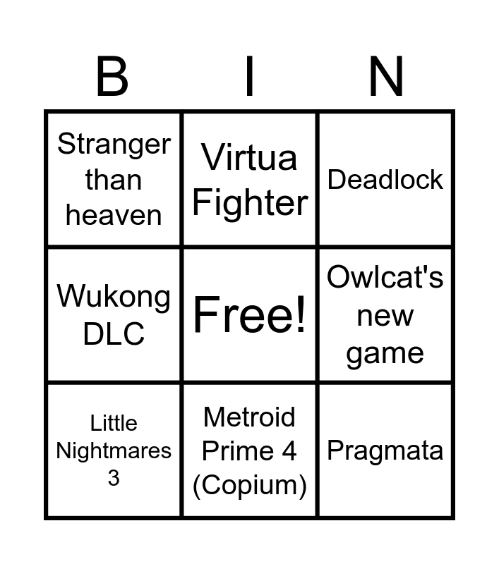 This bingo card has a free space and 8 words: Owlcat's new game, Deadlock, Virtua Fighter, Little Nightmares 3, Stranger than heaven, Pragmata, Wukong DLC and Metroid Prime 4 (Copium).