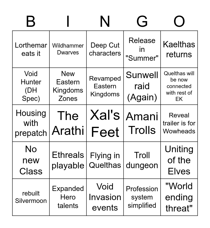 This bingo card has a free space and 24 words: Ethreals playable, Expanded Hero talents, Revamped Eastern Kingdoms, rebuilt Silvermoon, Kaelthas returns, Lorthemar eats it, Void Hunter (DH Spec), Wildhammer Dwarves, Amani Trolls, Flying in Quelthas, Sunwell raid (Again), Housing with prepatch, Troll dungeon, Uniting of the Elves, New Eastern Kingdoms Zones, Profession system simplified, Reveal trailer is for Wowheads, Deep Cut characters, Quelthas will be now connected with rest of EK, The Arathi, "World ending threat", No new Class, Release in "Summer" and Void Invasion events.