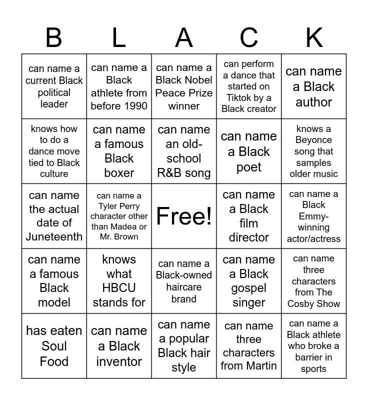 This bingo card has a free space and 24 words: knows what HBCU stands for, can name a Black inventor, can name an old-school R&B song, has eaten Soul Food, can name a Black author, can name a current Black political leader, knows how to do a dance move tied to Black culture, can name a Black athlete from before 1990, can name a Black film director, can name a Black-owned haircare brand, can name a Black poet, can name the actual date of Juneteenth, can name a Black gospel singer, can name three characters from The Cosby Show, can name a famous Black boxer, can name three characters from Martin, can name a Black Emmy-winning actor/actress, can name a Black Nobel Peace Prize winner, knows a Beyonce song that samples older music, can name a Tyler Perry character other than Madea or Mr. Brown, can name a Black athlete who broke a barrier in sports, can name a famous Black model, can perform a dance that started on Tiktok by a Black creator and can name a popular Black hair style.