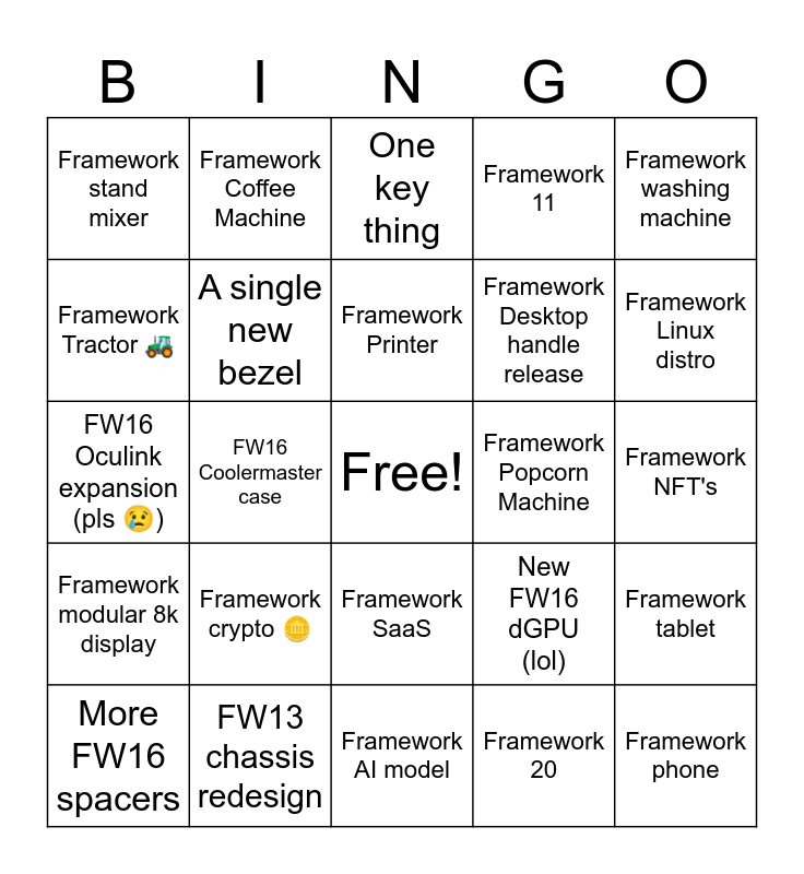 This bingo card has a free space and 24 words: Framework crypto 🪙, FW13 chassis redesign, Framework Printer, More FW16 spacers, Framework washing machine, Framework stand mixer, Framework Tractor 🚜, Framework Coffee Machine, Framework Popcorn Machine, Framework SaaS, Framework Desktop handle release, FW16 Oculink expansion (pls 😢), New FW16 dGPU (lol), Framework tablet, A single new bezel, Framework 20, Framework NFT's, One key thing, Framework Linux distro, FW16 Coolermaster case, Framework phone, Framework modular 8k display, Framework 11 and Framework AI model.