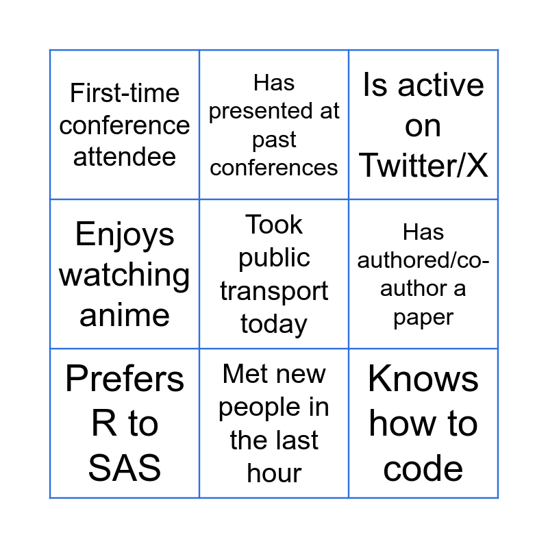 This bingo card has 76 words: Free!, Is an entrepreneur, Is active on Twitter/X, Attended a workshop recently, Learned a new skill this year, Wears glasses, Prefers spreadsheets over slides, Has hosted a webinar, Has implemented AI automation at work, Is wearing blue today, Grew up in another country, Has participated in a hackathon, Met new people in the last hour, Has authored/co-author a paper, Is excited rather than nervous about GEN AI, Has traveled 10+ countries, Prefers working at night, Has been working for 10+ years, Creates content on LinkedIn, Took public transport today, Loves minimalist design, Has a creative hobby, Prefers R to SAS, Has presented at past conferences, Enjoys watching anime, Brings snacks to meetings, Knows how to swim, Is planning to start a business, Works remotely full-time, Loves solving puzzles, Binge watches Sci-Fi shows, Reads tech blogs regularly, Passionate about sustainability, First-time public speaker, Started their current job this year, Knows how to code, Prefers podcasts to YouTube, Wrote an article recently, Owns a pet, Has worked in 3+ industries, Loves teaching or mentoring, Met someone from your city/state, Has attended 5+ conferences, Knows 3+ programming languages, Loves data visualization, Traveled abroad this year, Prefers tea over coffee, First-time conference attendee, Works in AI/ML field, Wearing something purple, Leads team meetings, Owns a smart home device, Speaks two or more languages, Enjoys giving presentations, Follows AI trends on social media, Registered last-minute for this event, Prefers pizza over burgers, Loves road trips over flying., Has attended a live concert this year., Knows how to cook and/or bake, Is a morning person, Prefers beaches over mountains, Enjoys gardening or is proud of their plants at home., Knows how to dance, Loves theme parks and roller coasters., Has switched careers, Has eaten dessert before dinner more than once., Knows how to play a musical instrument., Has worked in their current role for more than 5 years., Commutes 45 minutes or more to work., Loves spicy food, Can name one way AI is helping in healthcare., Has taken an online AI course or tutorial., Can name one famous movie about AI., Owns more than 15 pairs of shoes and Has been on a cruise.