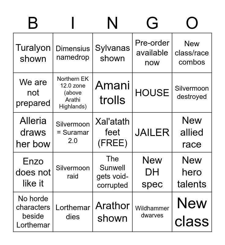 This bingo card has a free space and 24 words: Silvermoon raid, Lorthemar dies, Amani trolls, No horde characters beside Lorthemar, New class/race combos, Turalyon shown, We are not prepared, Dimensius namedrop, JAILER, The Sunwell gets void-corrupted, HOUSE, Alleria draws her bow, New DH spec, New hero talents, Northern EK 12.0 zone (above Arathi Highlands), Wildhammer dwarves, New allied race, Sylvanas shown, Silvermoon destroyed, Silvermoon = Suramar 2.0, New class, Enzo does not like it, Pre-order available now and Arathor shown.