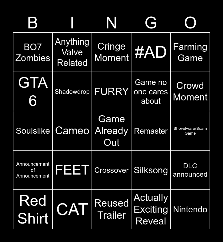 This bingo card has a free space and 24 words: FEET, CAT, FURRY, Red Shirt, Farming Game, BO7 Zombies, GTA 6, Anything Valve Related, Remaster, Crossover, Game no one cares about, Soulslike, Silksong, DLC announced, Shadowdrop, Actually Exciting Reveal, Shovelware/Scam Game, Cringe Moment, Crowd Moment, Cameo, Nintendo, Announcement of Announcement, #AD and Reused Trailer.