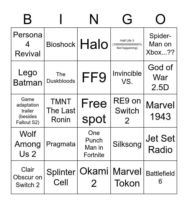 This bingo card has a free space and 24 words: Pragmata, Splinter Cell, FF9, Clair Obscur on Switch 2, Spider-Man on Xbox...??, Persona 4 Revival, Lego Batman, Bioshock, RE9 on Switch 2, One Punch Man in Fortnite, Invincible VS., Game adaptation trailer (besides Fallout S2), Silksong, Jet Set Radio, The Duskbloods, Marvel Tokon, Marvel 1943, Halo, God of War 2.5D, TMNT The Last Ronin, Battlefield 6, Wolf Among Us 2, Half Life 3 (100000000000000% Not happening) and Okami 2.