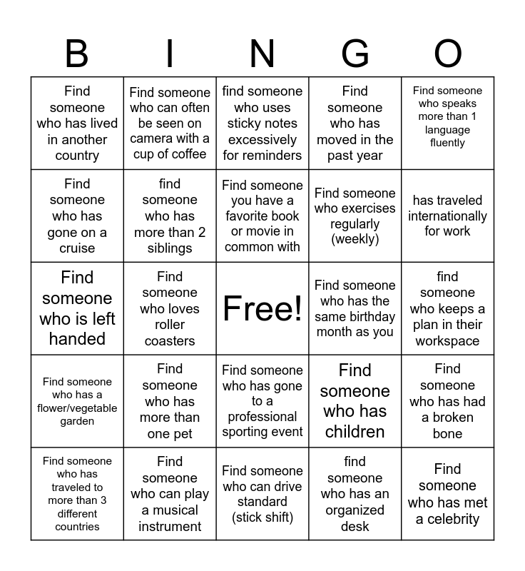 This bingo card has a free space and 24 words: Find someone who has more than one pet, Find someone who can play a musical instrument, Find someone you have a favorite book or movie in common with, Find someone who has traveled to more than 3 different countries, Find someone who speaks more than 1 language fluently, Find someone who has lived in another country, Find someone who has gone on a cruise, Find someone who can often be seen on camera with a cup of coffee, Find someone who has the same birthday month as you, Find someone who has gone to a professional sporting event, Find someone who exercises regularly (weekly), Find someone who is left handed, Find someone who has children, Find someone who has had a broken bone, find someone who has more than 2 siblings, find someone who has an organized desk, find someone who keeps a plan in their workspace, find someone who uses sticky notes excessively for reminders, has traveled internationally for work, Find someone who loves roller coasters, Find someone who has met a celebrity, Find someone who has a flower/vegetable garden, Find someone who has moved in the past year and Find someone who can drive standard (stick shift).