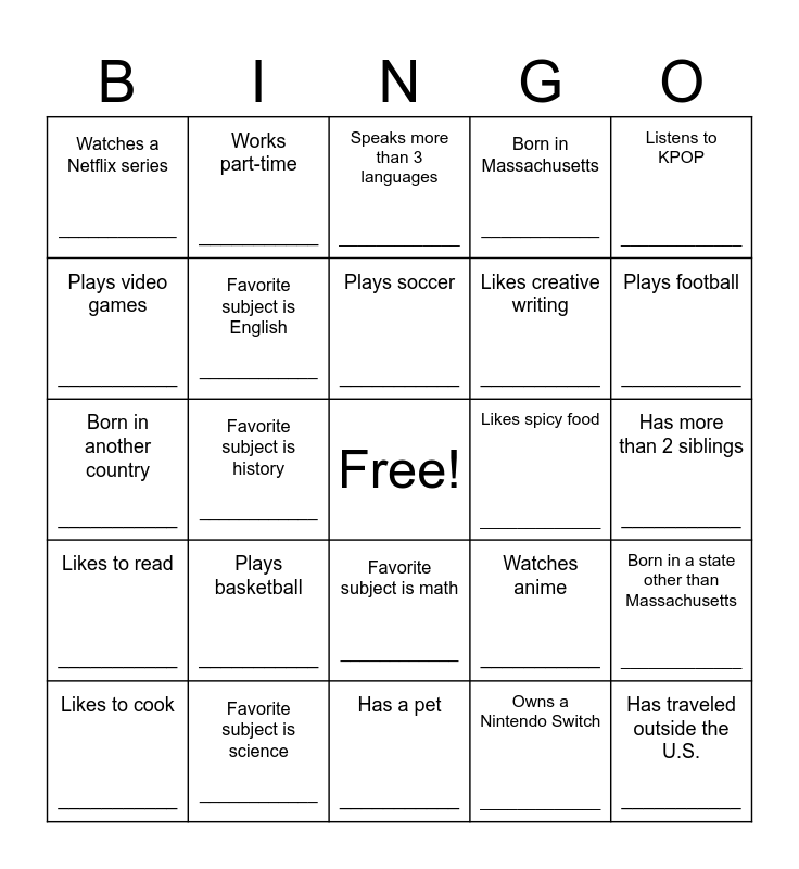This bingo card has a free space and 24 words: Plays basketball ___________, Favorite subject is science ____________, Plays soccer ___________, Likes to cook ___________, Listens to KPOP _____________, Watches a Netflix series ____________, Plays video games ___________, Works part-time ___________, Likes spicy food _____________, Favorite subject is math ____________, Likes creative writing ___________, Born in another country ___________, Watches anime ___________, Born in a state other than Massachusetts _____________, Favorite subject is English ____________, Owns a Nintendo Switch _____________, Has more than 2 siblings ___________, Speaks more than 3 languages _____________, Plays football ___________, Favorite subject is history ____________, Has traveled outside the U.S. ___________, Likes to read ___________, Born in Massachusetts ____________ and Has a pet ___________.