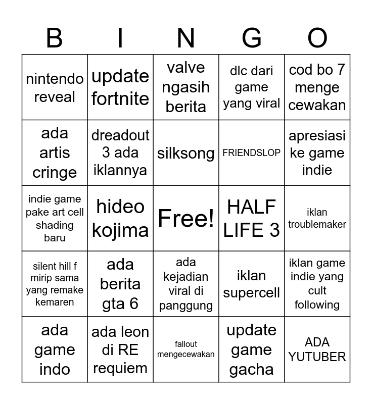 This bingo card has a free space and 24 words: ada game indo, ada berita gta 6, silksong, update game gacha, cod bo 7 menge cewakan, nintendo reveal, update fortnite, valve ngasih berita, HALF LIFE 3, iklan troublemaker, indie game pake art cell shading baru, dreadout 3 ada iklannya, iklan supercell, iklan game indie yang cult following, ada artis cringe, ada leon di RE requiem, fallout mengecewakan, dlc dari game yang viral, apresiasi ke game indie, silent hill f mirip sama yang remake kemaren, hideo kojima, ada kejadian viral di panggung, FRIENDSLOP and ADA YUTUBER.