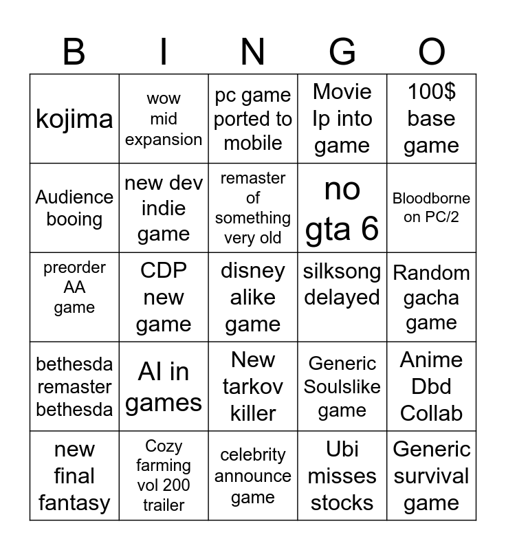 This bingo card has a free space and 24 words: AI in games, Cozy farming vol 200 trailer, remaster of something very old, new final fantasy, 100$ base game, kojima, Audience booing, wow mid expansion, silksong delayed, New tarkov killer, no gta 6, preorder AA game, Generic Soulslike game, Anime Dbd Collab, new dev indie game, Ubi misses stocks, Random gacha game, pc game ported to mobile, Bloodborne on PC/2, CDP new game, Generic survival game, bethesda remaster bethesda, Movie Ip into game and celebrity announce game.