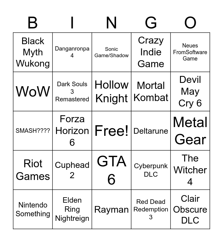 This bingo card has a free space and 24 words: Cuphead 2, Elden Ring Nightreign, Hollow Knight, Nintendo Something, Neues FromSoftware Game, Black Myth Wukong, WoW, Danganronpa 4, Deltarune, GTA 6, Mortal Kombat, SMASH????, Cyberpunk DLC, The Witcher 4, Dark Souls 3 Remastered, Red Dead Redemption 3, Metal Gear, Sonic Game/Shadow, Devil May Cry 6, Forza Horizon 6, Clair Obscure DLC, Riot Games, Crazy Indie Game and Rayman.