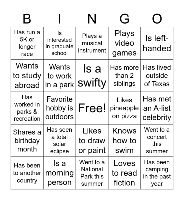 This bingo card has a free space and 29 words: Has been to another country, Is multilingual, Favorite hobby is outdoors, Has a pet other than a dog or cat, Has run a 5K or longer race, Plays a musical instrument, Wants to work in a park, Has seen a total solar eclipse, Likes pineapple on pizza, Is a morning person, Has met an A-list celebrity, Has been camping in the past year, Went to a National Park this summer, Loves to read fiction, Has lived outside of Texas, Watches documentaries for fun, Likes to draw or paint, Shares a birthday month, Is left-handed, Has worked in parks & recreation, Knows how to swim, Middle name starts with a vowel, Has more than 2 siblings, Wants to study abroad, Plays video games, Is interested in graduate school, Went to a concert this summer, Is a swifty and Likes group projects over indiviudal work.