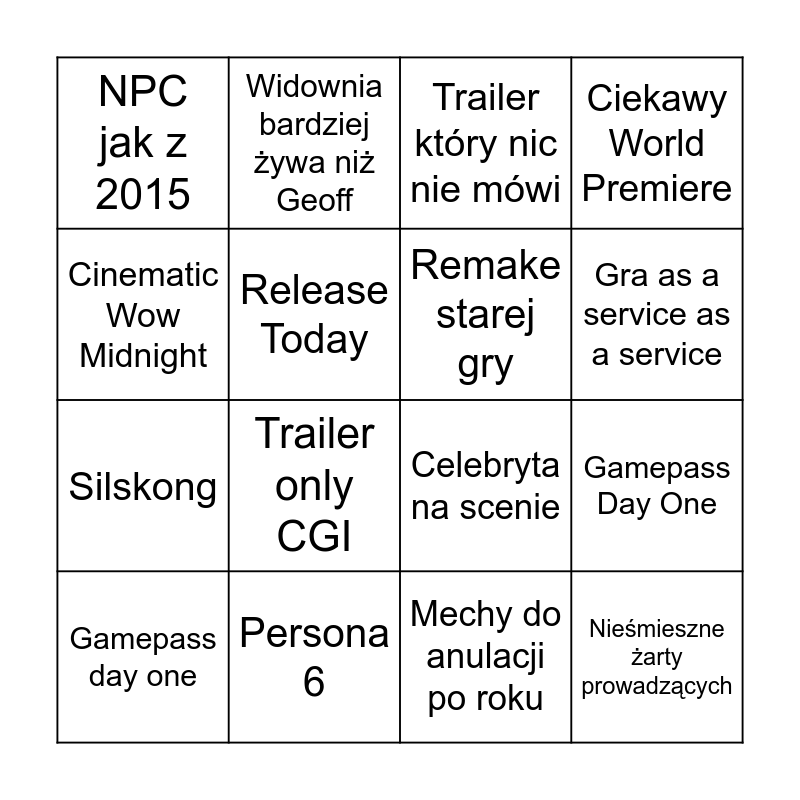 This bingo card has 16 words: Persona 6, Gamepass Day One, Trailer który nic nie mówi, NPC jak z 2015, Silskong, Widownia bardziej żywa niż Geoff, Celebryta na scenie, Mechy do anulacji po roku, Cinematic Wow Midnight, Release Today, Gamepass day one, Ciekawy World Premiere, Trailer only CGI, Gra as a service as a service, Remake starej gry and Nieśmieszne żarty prowadzących.