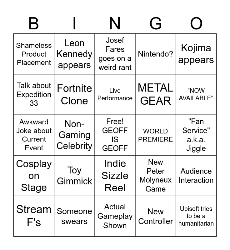 This bingo card has a free space and 26 words: Indie Sizzle Reel, New Controller, Live Performance, Someone swears, Kojima appears, Shameless Product Placement, Talk about Expedition 33, Leon Kennedy appears, "Fan Service" a.k.a. Jiggle, New Peter Molyneux Game, METAL GEAR, Awkward Joke about Current Event, Audience Interaction, Stream F's, Non-Gaming Celebrity, Crappy Mobile Game, Nintendo?, Cosplay on Stage, Josef Fares goes on a weird rant, Ubisoft tries to be a humanitarian, "NOW AVAILABLE", Actual Gameplay Shown, WORLD PREMIERE, Toy Gimmick, Fortnite Clone and Hades Clone.
