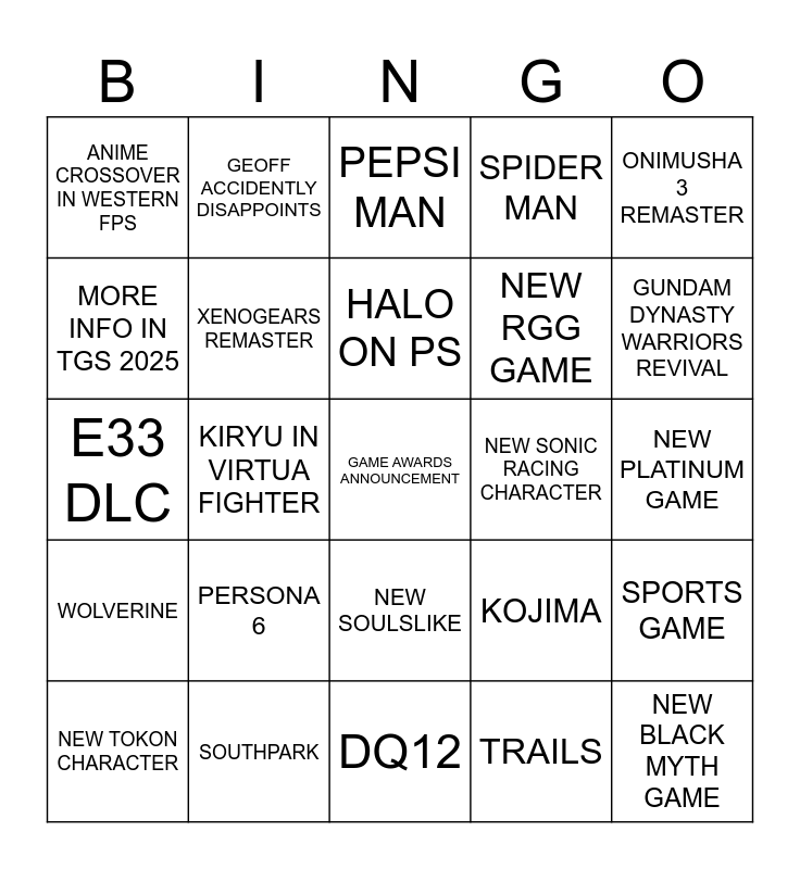 This bingo card has a free space and 24 words: PERSONA 6, SOUTHPARK, HALO ON PS, NEW TOKON CHARACTER, ONIMUSHA 3 REMASTER, ANIME CROSSOVER IN WESTERN FPS, MORE INFO IN TGS 2025, GEOFF ACCIDENTLY DISAPPOINTS, NEW SONIC RACING CHARACTER, NEW SOULSLIKE, NEW RGG GAME, E33 DLC, KOJIMA, SPORTS GAME, XENOGEARS REMASTER, TRAILS, NEW PLATINUM GAME, PEPSI MAN, GUNDAM DYNASTY WARRIORS REVIVAL, KIRYU IN VIRTUA FIGHTER, NEW BLACK MYTH GAME, WOLVERINE, SPIDER MAN and DQ12.