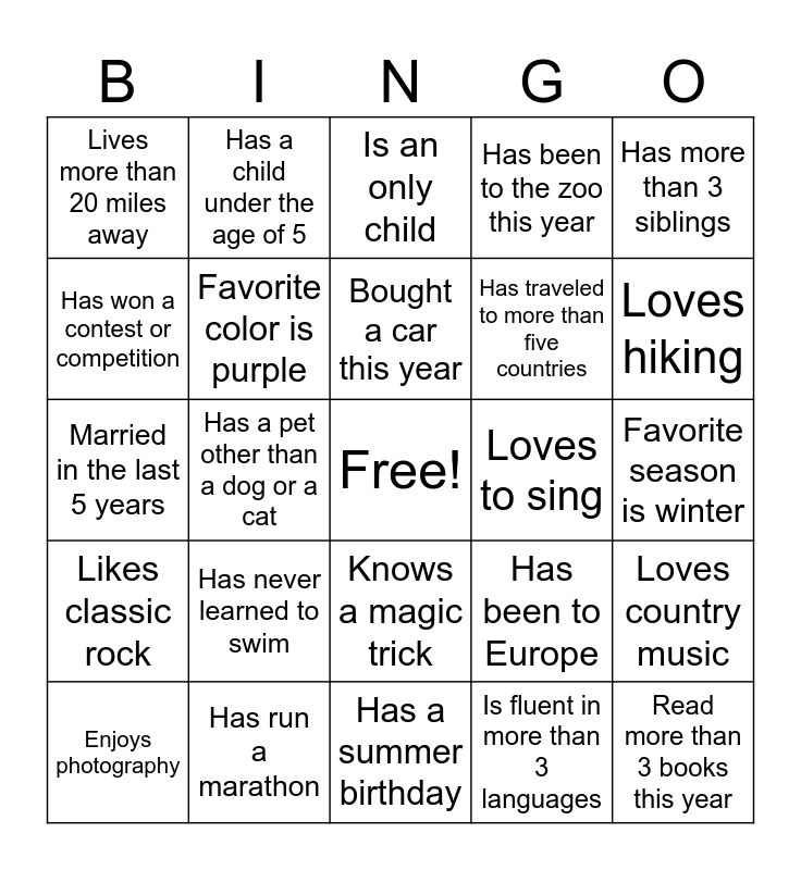 This bingo card has a free space and 24 words: Has never learned to swim, Has run a marathon, Bought a car this year, Enjoys photography, Has more than 3 siblings, Lives more than 20 miles away, Has won a contest or competition, Has a child under the age of 5, Loves to sing, Knows a magic trick, Has traveled to more than five countries, Married in the last 5 years, Has been to Europe, Loves country music, Favorite color is purple, Is fluent in more than 3 languages, Favorite season is winter, Is an only child, Loves hiking, Has a pet other than a dog or a cat, Read more than 3 books this year, Likes classic rock, Has been to the zoo this year and Has a summer birthday.