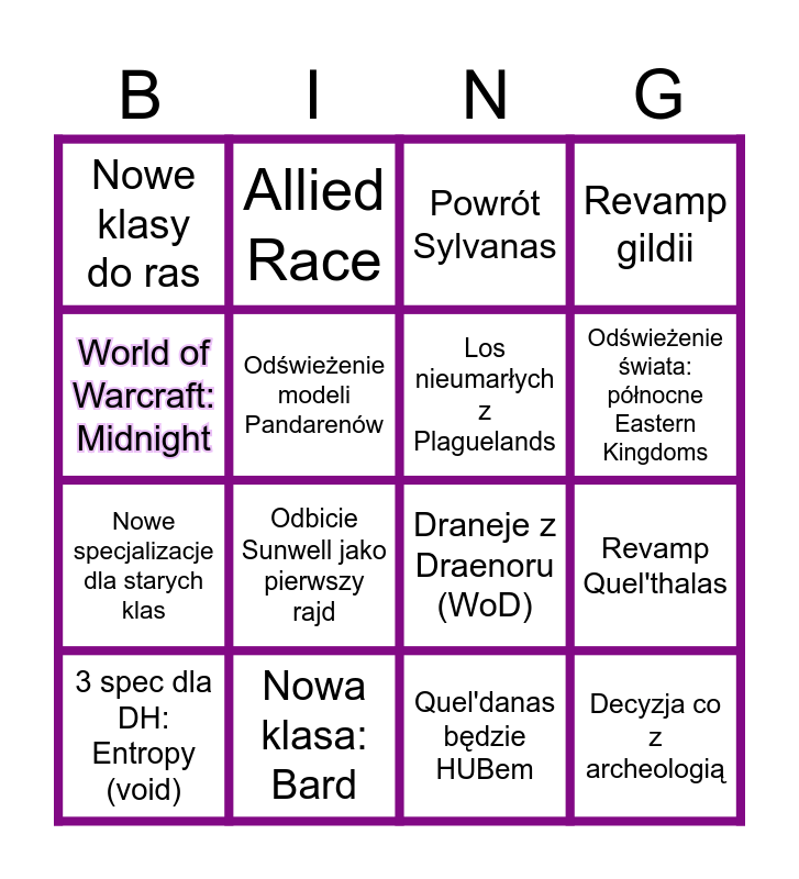This bingo card has 16 words: Nowa klasa: Bard, Revamp Quel'thalas, Powrót Sylvanas, Nowe klasy do ras, Nowe specjalizacje dla starych klas, Allied Race, Draneje z Draenoru (WoD), Quel'danas będzie HUBem, World of Warcraft: Midnight, Odświeżenie modeli Pandarenów, 3 spec dla DH: Entropy (void), Revamp gildii, Odbicie Sunwell jako pierwszy rajd, Odświeżenie świata: północne Eastern Kingdoms, Los nieumarłych z Plaguelands and Decyzja co z archeologią.