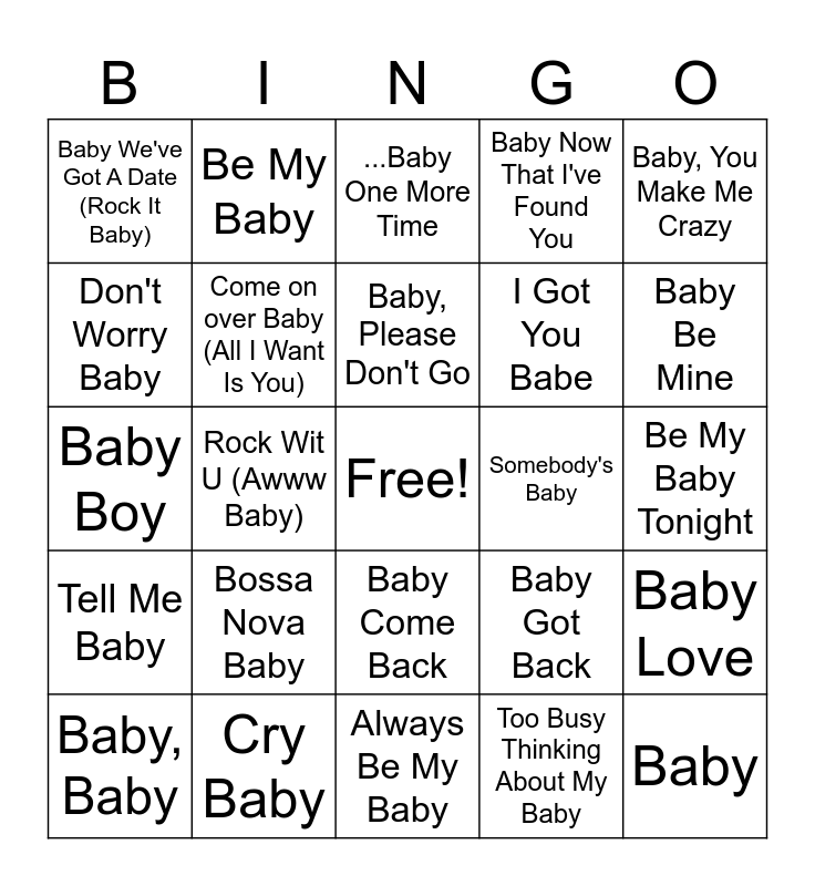 This bingo card has a free space and 29 words: Baby, Baby, Baby, I Love You, Rock Wit U (Awww Baby), Baby, I Love Your Way, Baby We've Got A Date (Rock It Baby), ...Baby One More Time, Come on over Baby (All I Want Is You), Bossa Nova Baby, Somebody's Baby, Cry Baby, Be My Baby Tonight, Baby, Always Be My Baby, Too Busy Thinking About My Baby, Baby Be Mine, Hey Baby, Baby Come Back, Tell Me Baby, Baby, You Make Me Crazy, Baby Boy, Baby Got Back, Can't Get Enough Of You Baby, I Got You Babe, Don't Worry Baby, Baby Now That I've Found You, Be My Baby, Baby Love, Baby, Please Don't Go and Ice Ice Baby.
