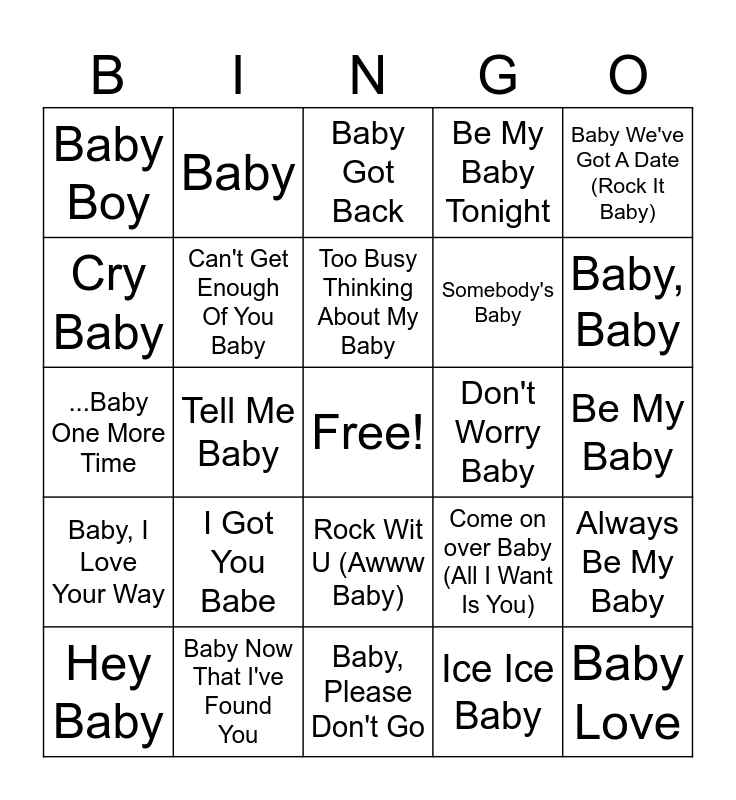 This bingo card has a free space and 29 words: Hey Baby, Baby Come Back, Tell Me Baby, Baby, You Make Me Crazy, Baby Boy, Baby Got Back, Can't Get Enough Of You Baby, I Got You Babe, Don't Worry Baby, Baby Now That I've Found You, Be My Baby, Baby Love, Baby, Please Don't Go, Ice Ice Baby, Baby, Baby, Baby, I Love You, Rock Wit U (Awww Baby), Baby, I Love Your Way, Baby We've Got A Date (Rock It Baby), ...Baby One More Time, Come on over Baby (All I Want Is You), Bossa Nova Baby, Somebody's Baby, Cry Baby, Be My Baby Tonight, Baby, Always Be My Baby, Too Busy Thinking About My Baby and Baby Be Mine.