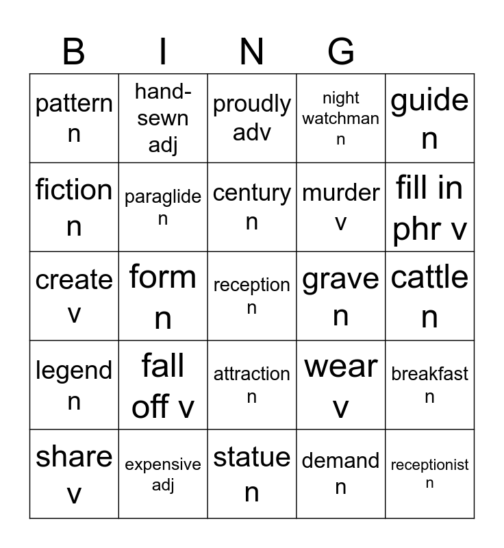 This bingo card has 86 words: Free!, arrive v, attraction n, B&B = bed and breakfast n, bagpiper n, bagpipes n pl, belong (to) v, board game n, building n, bury v, capital n, castle n, breakfast n, cattle n, celebrate v, century n, check in (at) phr v, city council n, clan n, clothing n, coastline n, countryside n, create v, customer n, demand n, design v, diary n, entry n, event n, exchange v, expensive adj, explore v, fact n, fall off v, fiction n, figure n, fill in phr v, first name n, fit n, form n, fountain n, gardener n, gate n, grave n, greet v, guide n, guided tour n, hand-sewn adj, hip n, honour n, huge adj, island n, legend n, length n, married (to) adj, measure v, memory n, murder v, night watchman n, paraglide n, pattern n, payment n, percentage n, popular adj, protect n, proudly adv, put up phr v, reception n, receptionist n, rough adj, row v, sausage n, share v, sheep n, shelter n, skill n, statue n, surname n, surprising adj, tight adj, traditional adj, travel guide n, uncomfortable adj, view n, wear v and youth hostel n.