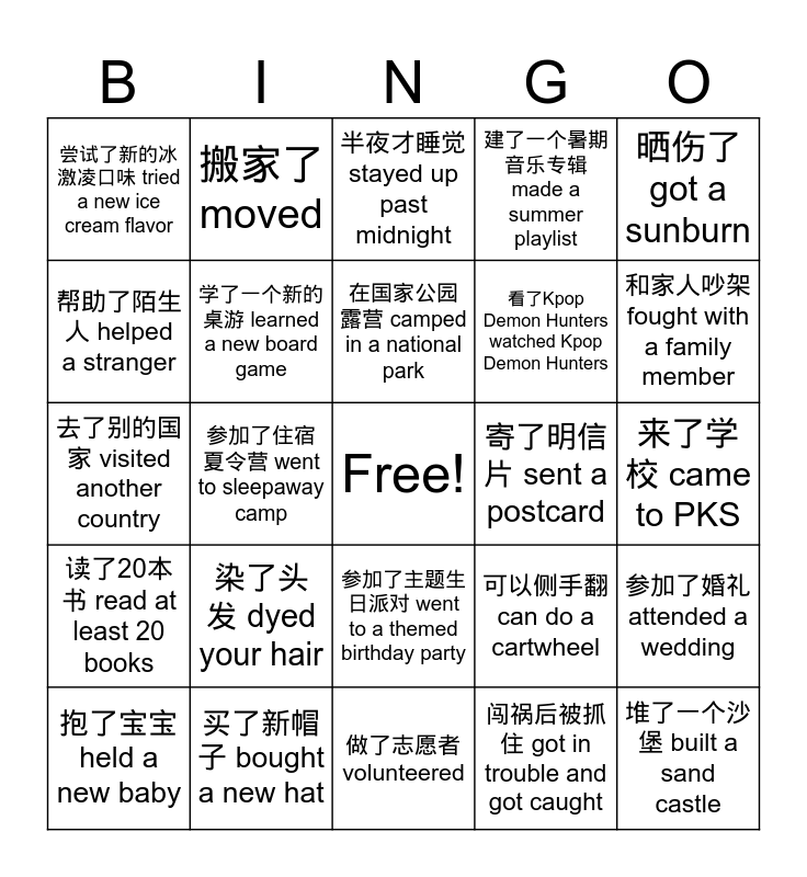 This bingo card has a free space and 26 words: 参加了主题生日派对 went to a themed birthday party, 闯祸后被抓住 got in trouble and got caught, 在国家公园露营 camped in a national park, 买了新帽子 bought a new hat, 晒伤了 got a sunburn, 尝试了新的冰激凌口味 tried a new ice cream flavor, 帮助了陌生人 helped a stranger, 搬家了 moved, 来了学校 came to PKS, 可以侧手翻 can do a cartwheel, 看了Kpop Demon Hunters watched Kpop Demon Hunters, 去了别的国家 visited another country, 参加了婚礼 attended a wedding, 抱了宝宝 held a new baby, 参加了住宿夏令营 went to sleepaway camp, 得到了新的宠物 got a new pet, 建了一个暑期音乐专辑 made a summer playlist, 读了20本书 read at least 20 books, 半夜才睡觉 stayed up past midnight, 堆了一个沙堡 built a sand castle, 和家人吵架 fought with a family member, 做了志愿者 volunteered, 寄了明信片 sent a postcard, 染了头发 dyed your hair, 学了一个新的桌游 learned a new board game and 看到了一个很酷的云 found a cool-shaped cloud.