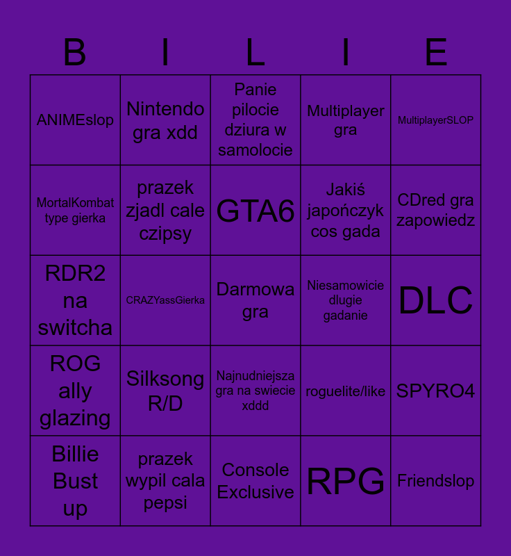 This bingo card has a free space and 24 words: Silksong R/D, prazek wypil cala pepsi, GTA6, Billie Bust up, MultiplayerSLOP, ANIMEslop, MortalKombat type gierka, Nintendo gra xdd, Niesamowicie dlugie gadanie, Najnudniejsza gra na swiecie xddd, Jakiś japończyk cos gada, RDR2 na switcha, roguelite/like, SPYRO4, prazek zjadl cale czipsy, RPG, DLC, Panie pilocie dziura w samolocie, CDred gra zapowiedz, CRAZYassGierka, Friendslop, ROG ally glazing, Multiplayer gra and Console Exclusive.
