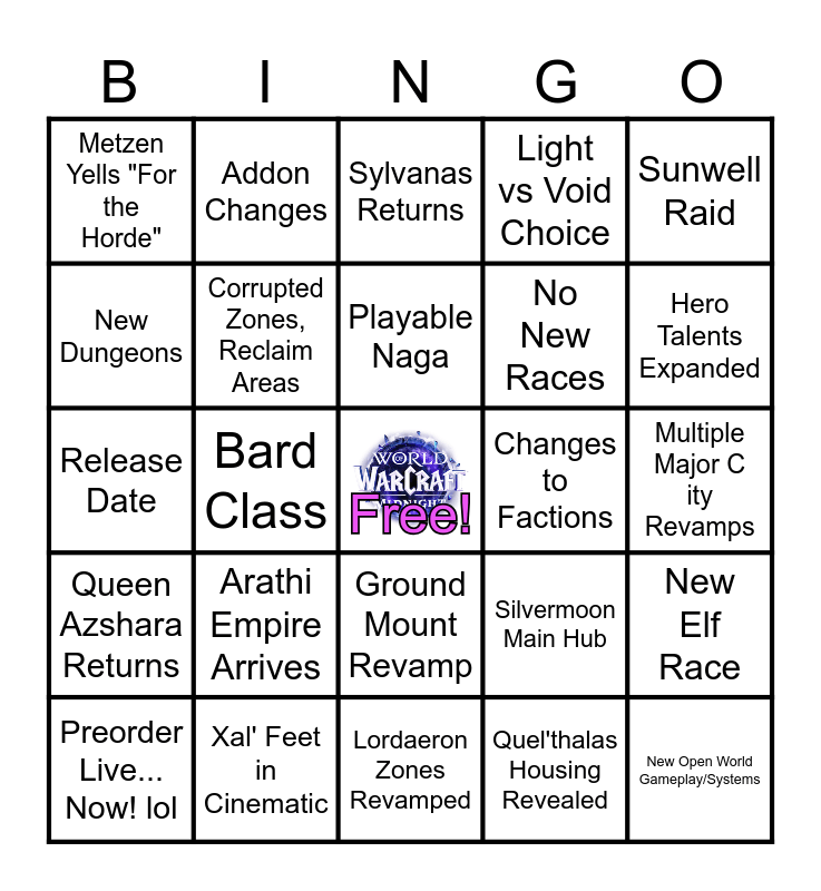 This bingo card has a free space and 30 words: Xal' Feet in Cinematic, Player Housing Demo, Bard Class, Ion says "exciting new chapter", Metzen Yells "For the Horde", Sylvanas Returns, Corrupted Zones, Reclaim Areas, Ground Mount Revamp, Changes to Factions, Lordaeron Zones Revamped, Multiple Major City Revamps, New Open World Gameplay/Systems, Quel'thalas Housing Revealed, Ghostlands Revamped, Hero Talents Expanded, Paladin For More Races, Silvermoon Main Hub, Queen Azshara Returns, Arathi Empire Arrives, Sunwell Raid, Release Date, Quality of Life Improvements, Addon Changes, No New Races, New Dungeons, Light vs Void Choice, New Elf Race, Preorder Live... Now! lol, Playable Naga and Amani Troll Reputation.