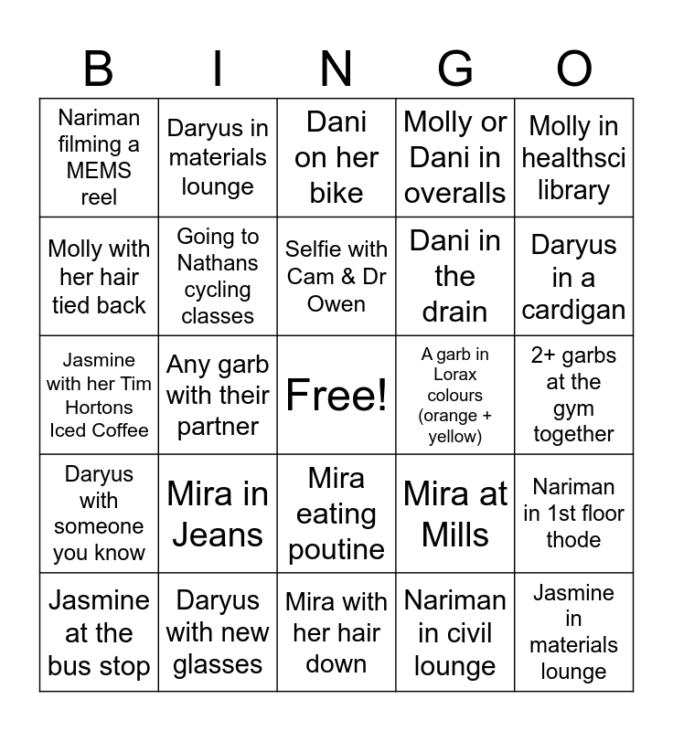 This bingo card has a free space and 24 words: Mira in Jeans, Daryus with new glasses, Selfie with Cam & Dr Owen, Jasmine at the bus stop, Molly in healthsci library, Nariman filming a MEMS reel, Molly with her hair tied back, Daryus in materials lounge, A garb in Lorax colours (orange + yellow), Mira eating poutine, Dani in the drain, Jasmine with her Tim Hortons Iced Coffee, Mira at Mills, Nariman in 1st floor thode, Going to Nathans cycling classes, Nariman in civil lounge, 2+ garbs at the gym together, Dani on her bike, Daryus in a cardigan, Any garb with their partner, Jasmine in materials lounge, Daryus with someone you know, Molly or Dani in overalls and Mira with her hair down.