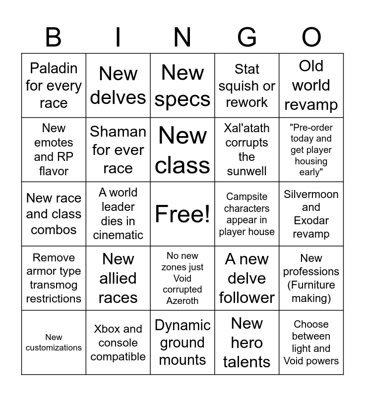 This bingo card has a free space and 24 words: New customizations, New allied races, New class, New hero talents, Old world revamp, Paladin for every race, New delves, New specs, Campsite characters appear in player house, Silvermoon and Exodar revamp, New race and class combos, Shaman for ever race, A new delve follower, New professions (Furniture making), New emotes and RP flavor, Xbox and console compatible, Dynamic ground mounts, Stat squish or rework, "Pre-order today and get player housing early", Remove armor type transmog restrictions, A world leader dies in cinematic, No new zones just Void corrupted Azeroth, Xal'atath corrupts the sunwell and Choose between light and Void powers.