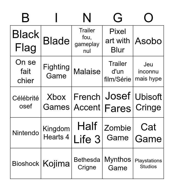 This bingo card has a free space and 24 words: Kingdom Hearts 4, Kojima, Malaise, Bioshock, Asobo, Black Flag, On se fait chier, Blade, Josef Fares, Half Life 3, Trailer d'un film/Série, Célébrité osef, Zombie Game, Cat Game, Fighting Game, Mynthos Game, Ubisoft Cringe, Trailer fou, gameplay nul, Jeu inconnu mais hype, Xbox Games, Playstations Studios, Nintendo, Pixel art with Blur and Bethesda Crigne.