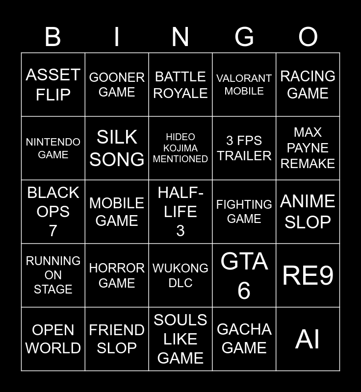 This bingo card has a free space and 24 words: HORROR GAME, FRIEND SLOP, HIDEO KOJIMA MENTIONED, OPEN WORLD, RACING GAME, ASSET FLIP, NINTENDO GAME, GOONER GAME, FIGHTING GAME, WUKONG DLC, 3 FPS TRAILER, BLACK OPS 7, GTA 6, RE9, SILK SONG, GACHA GAME, ANIME SLOP, BATTLE ROYALE, MAX PAYNE REMAKE, MOBILE GAME, AI, RUNNING ON STAGE, VALORANT MOBILE and SOULS LIKE GAME.