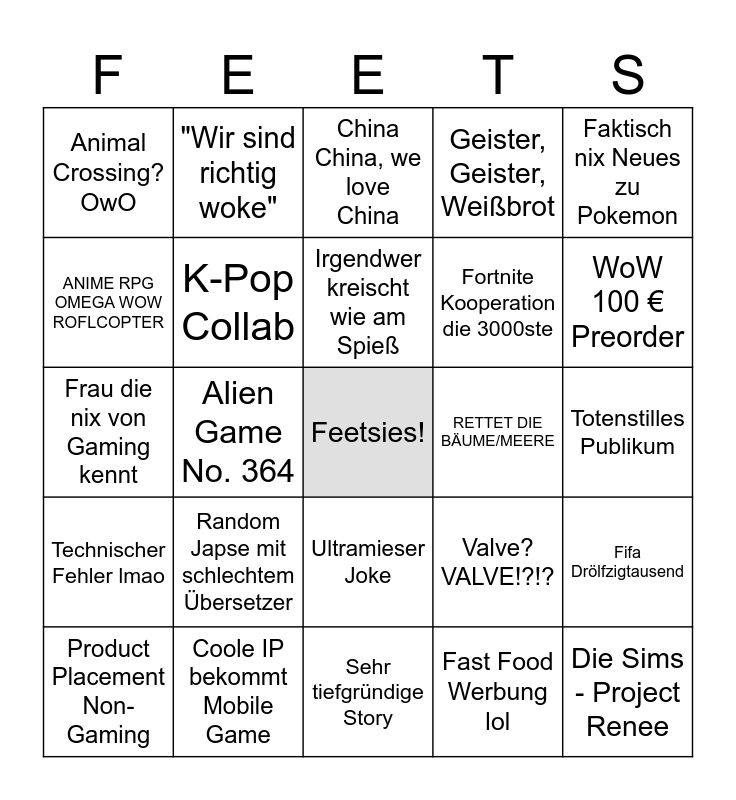 This bingo card has a free space and 24 words: Random Japse mit schlechtem Übersetzer, Coole IP bekommt Mobile Game, Irgendwer kreischt wie am Spieß, Product Placement Non-Gaming, Faktisch nix Neues zu Pokemon, Animal Crossing? OwO, ANIME RPG OMEGA WOW ROFLCOPTER, "Wir sind richtig woke", RETTET DIE BÄUME/MEERE, Ultramieser Joke, Fortnite Kooperation die 3000ste, Frau die nix von Gaming kennt, Valve? VALVE!?!?, Fifa Drölfzigtausend, K-Pop Collab, Fast Food Werbung lol, Totenstilles Publikum, China China, we love China, WoW 100 € Preorder, Alien Game No. 364, Die Sims - Project Renee, Technischer Fehler lmao, Geister, Geister, Weißbrot and Sehr tiefgründige Story.