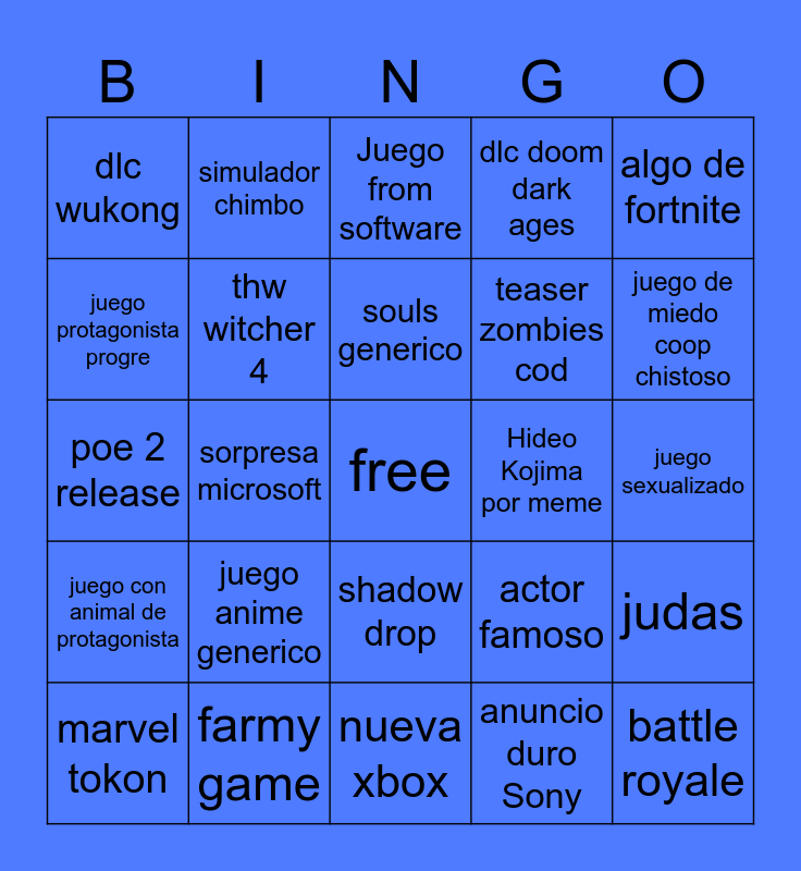 This bingo card has a free space and 24 words: juego anime generico, farmy game, souls generico, marvel tokon, algo de fortnite, dlc wukong, juego protagonista progre, simulador chimbo, Hideo Kojima por meme, shadow drop, teaser zombies cod, poe 2 release, actor famoso, judas, thw witcher 4, anuncio duro Sony, juego sexualizado, Juego from software, juego de miedo coop chistoso, sorpresa microsoft, battle royale, juego con animal de protagonista, dlc doom dark ages and nueva xbox.