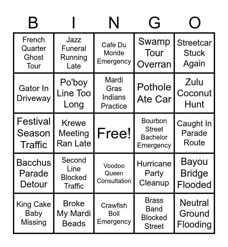This bingo card has a free space and 25 words: Second Line Blocked Traffic, Crawfish Boil Emergency, Mardi Gras Indians Practice, King Cake Baby Missing, Streetcar Stuck Again, French Quarter Ghost Tour, Gator In Driveway, Jazz Funeral Running Late, Bourbon Street Bachelor Emergency, Voodoo Queen Consultation, Pothole Ate Car, Festival Season Traffic, Hurricane Party Cleanup, Bayou Bridge Flooded, Po'boy Line Too Long, Saints Game Traffic, Caught In Parade Route, Cafe Du Monde Emergency, Zulu Coconut Hunt, Krewe Meeting Ran Late, Neutral Ground Flooding, Broke My Mardi Beads, Bacchus Parade Detour, Swamp Tour Overran and Brass Band Blocked Street.