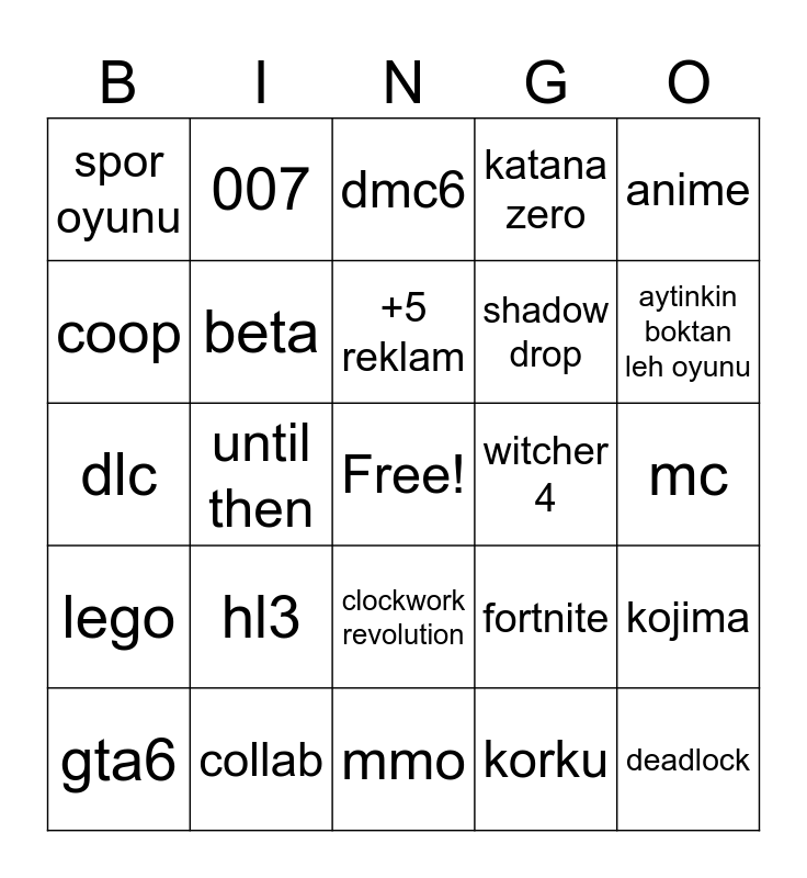 This bingo card has a free space and 24 words: hl3, collab, +5 reklam, gta6, anime, spor oyunu, coop, 007, witcher 4, clockwork revolution, shadow drop, dlc, fortnite, kojima, beta, korku, mc, dmc6, aytinkin boktan leh oyunu, until then, deadlock, lego, katana zero and mmo.