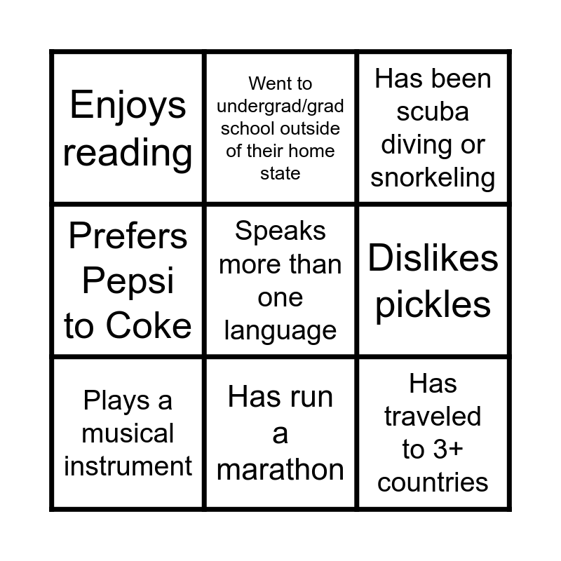 This bingo card has 9 words: Plays a musical instrument, Has been scuba diving or snorkeling, Went to undergrad/grad school outside of their home state, Prefers Pepsi to Coke, Enjoys reading, Dislikes pickles, Speaks more than one language, Has traveled to 3+ countries and Has run a marathon.